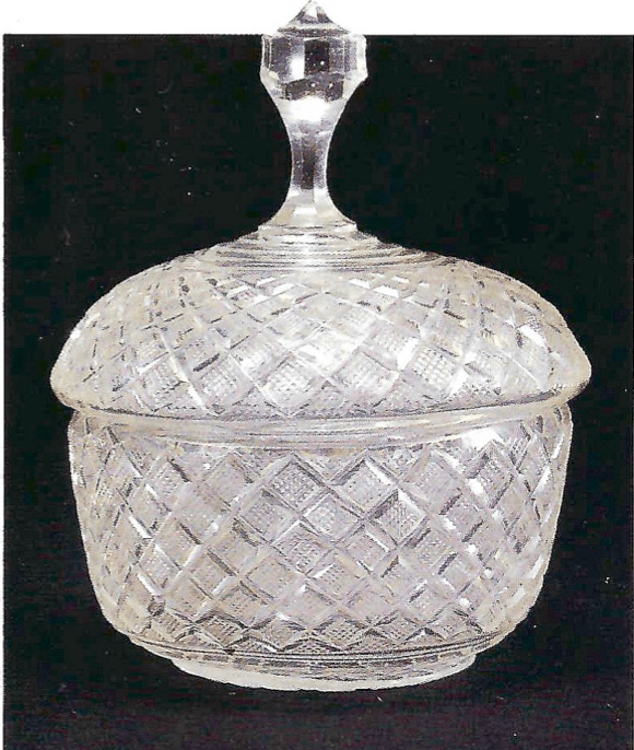 En 1846, Shimazu Narioki (1791-1859), le seigneur de l’époque, avait invité un artisan verrier d’Edo, Yotsumoto Kamejirô, pour débuter la fabrication de verre dans le fief de Satsuma. Shimazu Nariakira fit progresser cette technique pour aboutir à des verres appelés Satsuma Kiriko. Leur forme particulière est reconnaissable à la couche de verre teintée et ciselée en divers motifs qui recouvre le verre transparent. Toutefois, certaines pièces ne sont pas recouvertes d’émail, comme ce pot à facettes doté d’un couvercle (pièce transmise au sein de la famille Tamasato – Shimazu).