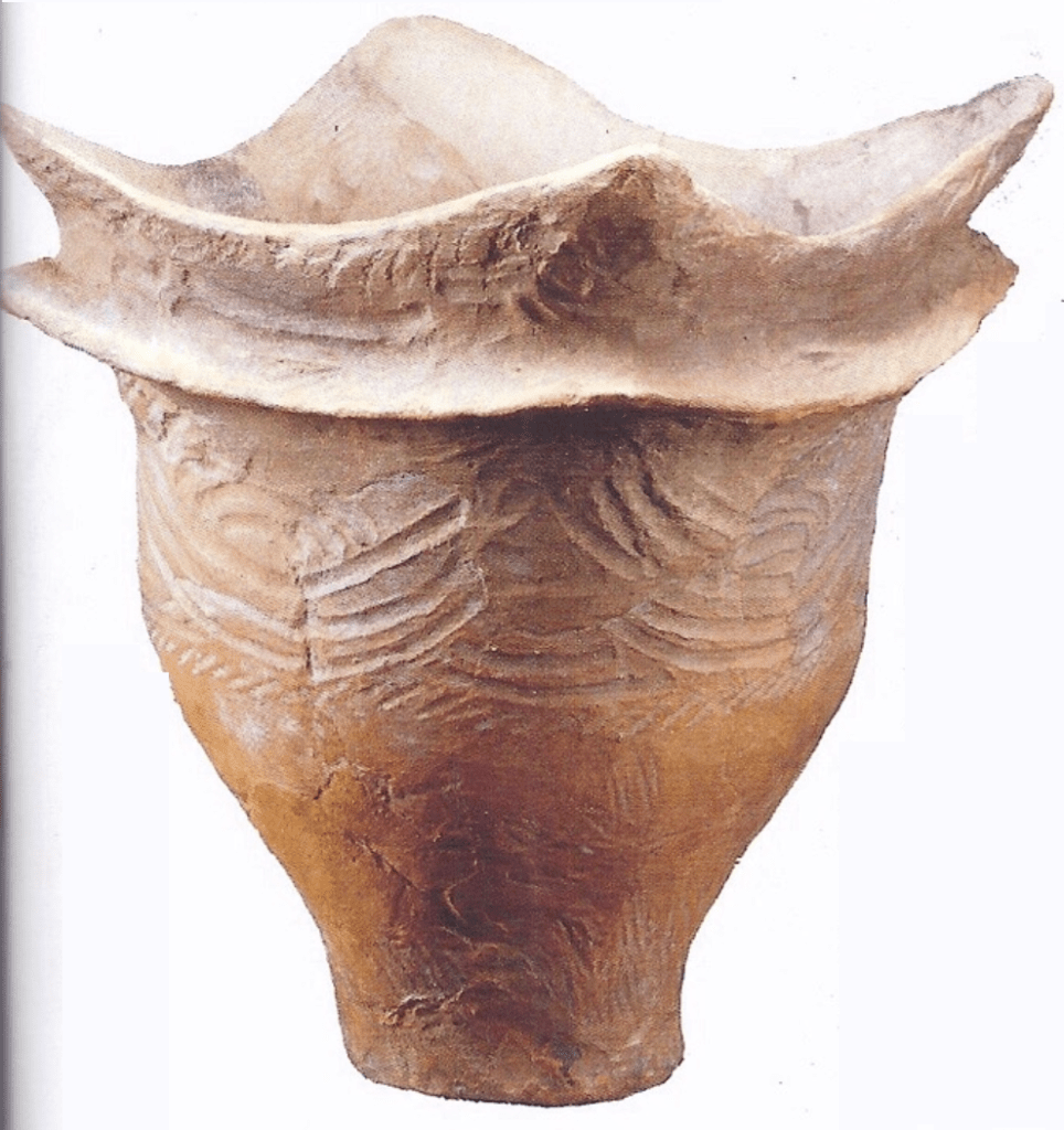 Il s’agit d’une céramique de type Ichiki datant du milieu du Jōmon Tardif (2500 – 1300 av. J.-C.). Le plan du col est surélevé par des anses triangulaires, décorées de lignes courbes réalisées au moyen de coquillages. Les autres motifs visibles sur la panse ont également été imprimés avec des coquillages. De même, les amas coquilliers retrouvés à de nombreux endroits, ainsi que les objets à usage religieux figurant des bateaux et fabriqués en pierre ponce, témoignent d’une forte dépendance à la mer. L’étendue géographique de ce type de sites est extrêmement vaste, allant du nord-ouest de Kyūshū à Okinawa.