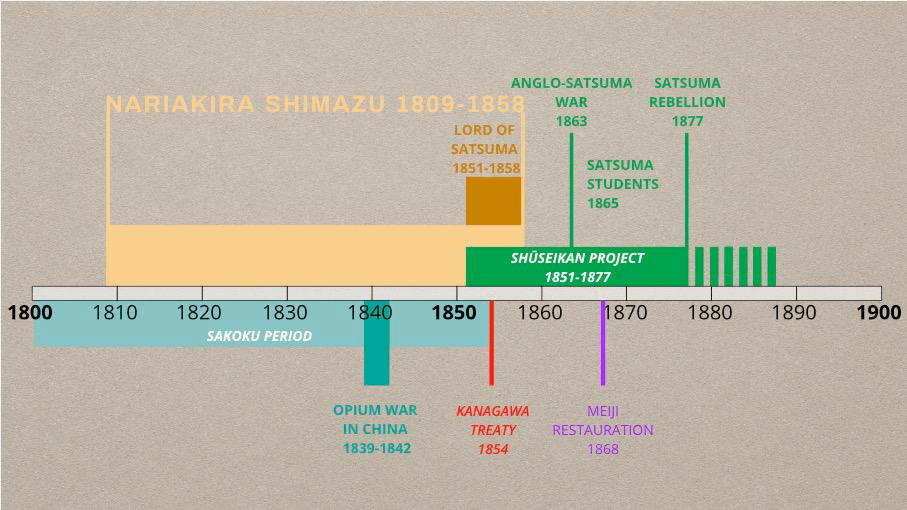 Shimazu Nariakira (1809-1858), grâce aux finances assainies par ses prédécesseurs et des ressources humaines bien formées, se lança dans l’introduction des savoirs et des techniques modernes venus d’Europe (projet Shūseikan). La défaite du fief lors de la guerre anglo-Satsuma de 1863 le décida à s’engager résolument dans une politique d’ouverture : envoi d’étudiants à l’étranger, participation à l’exposition universelle de Paris (1867).
